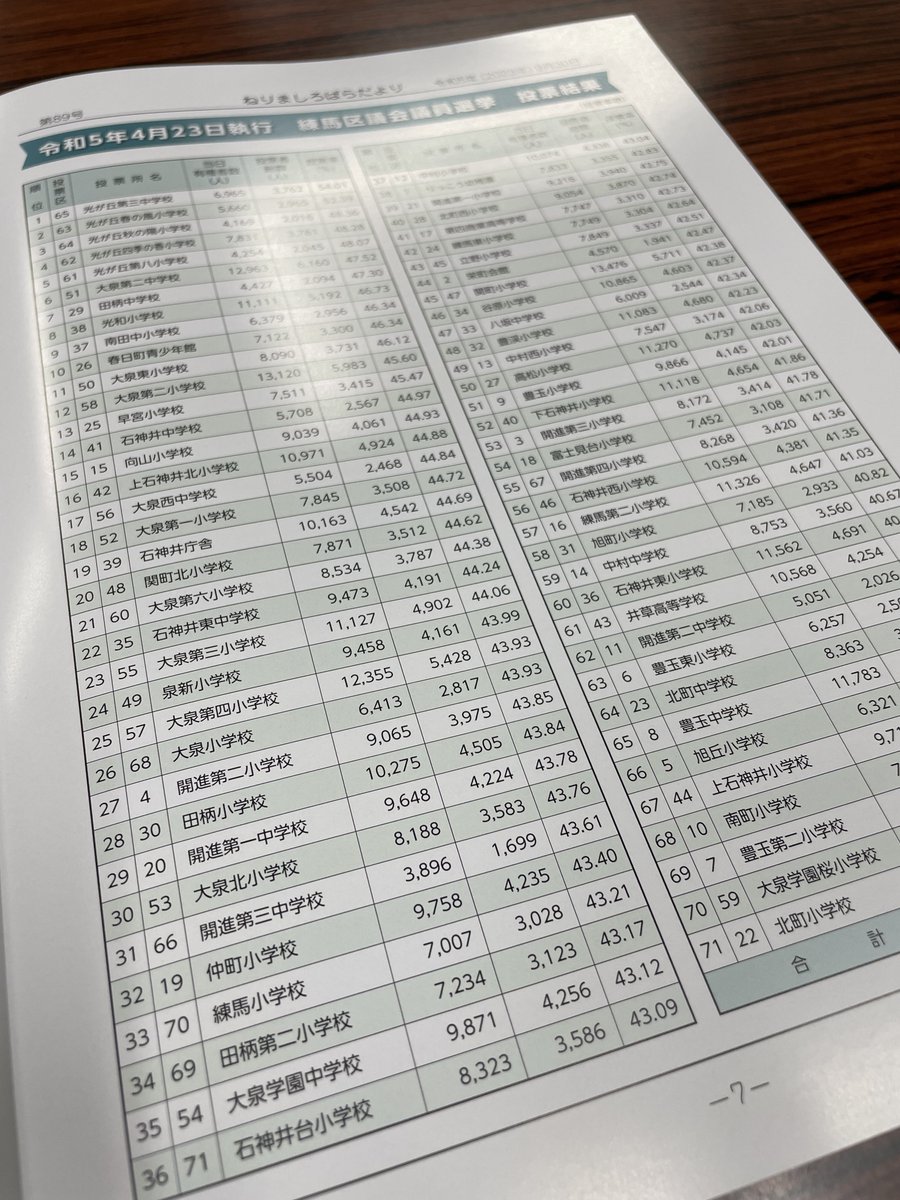 7ページでは、令和5年4月23日執行 #練馬区議会議員選挙 の投票所別の投票率をランキング形式で紹介しています!詳しくは、リンク先をチェック!