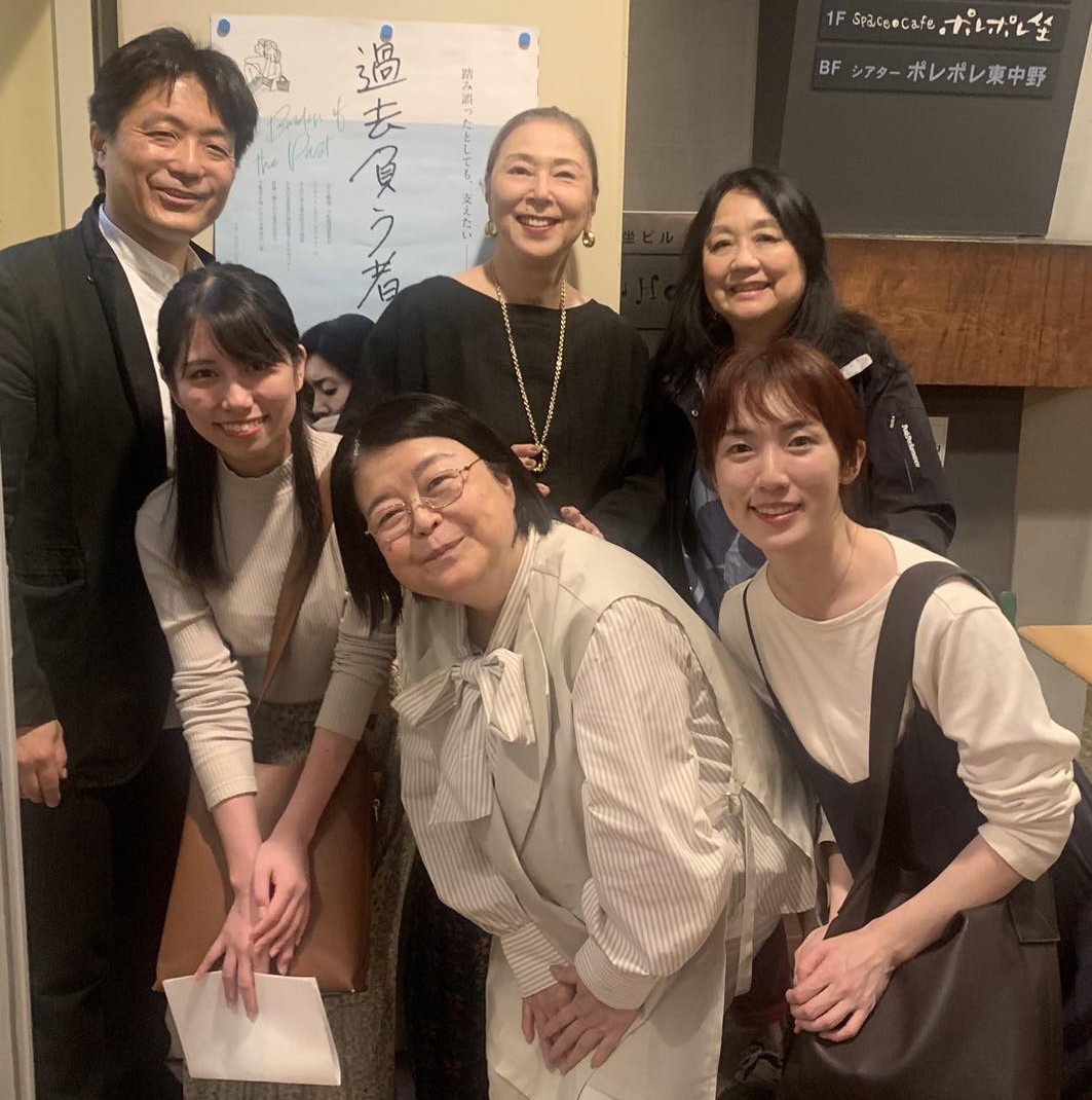 映画「過去負う者」のトークライブのゲスト、小説家の桐野夏生さん、舩橋淳監督、そして日本女子大の大沢真知子名誉教授、映画出演の俳優さんたちと一緒にパチリ。