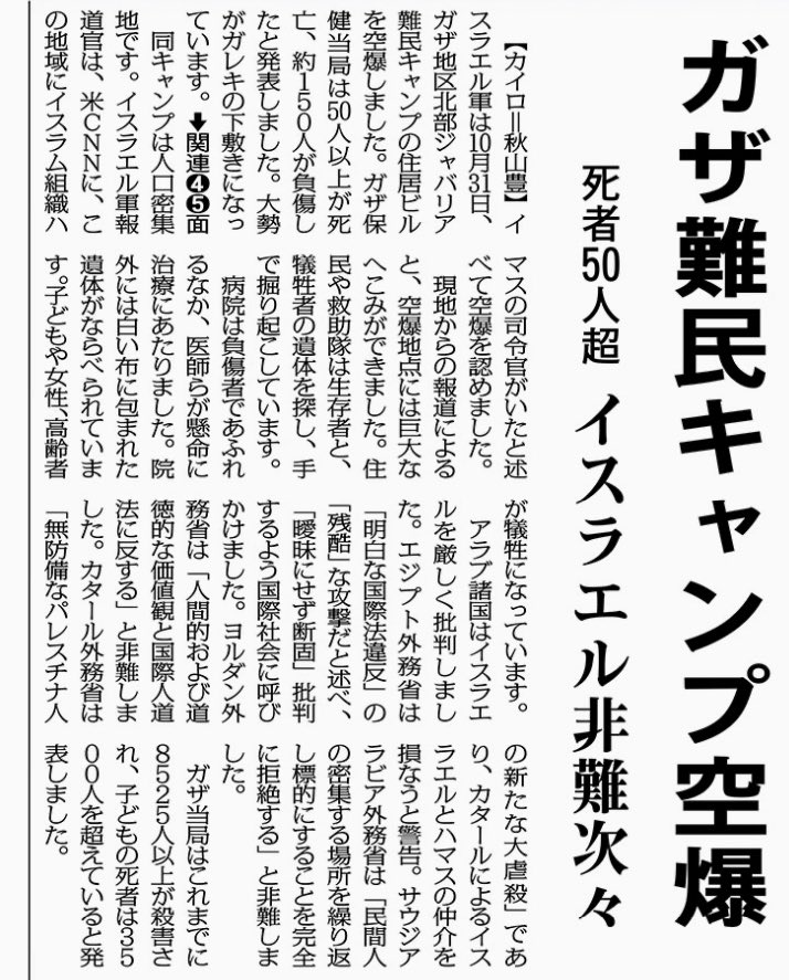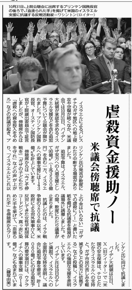 アメリカはイスラエルへの軍事支援で143億ドルも計上。ヨルダン提出の国連決議には反対。一方米国民がノーの声を突きつけています。日本はアメリカに追随すべきではありません。