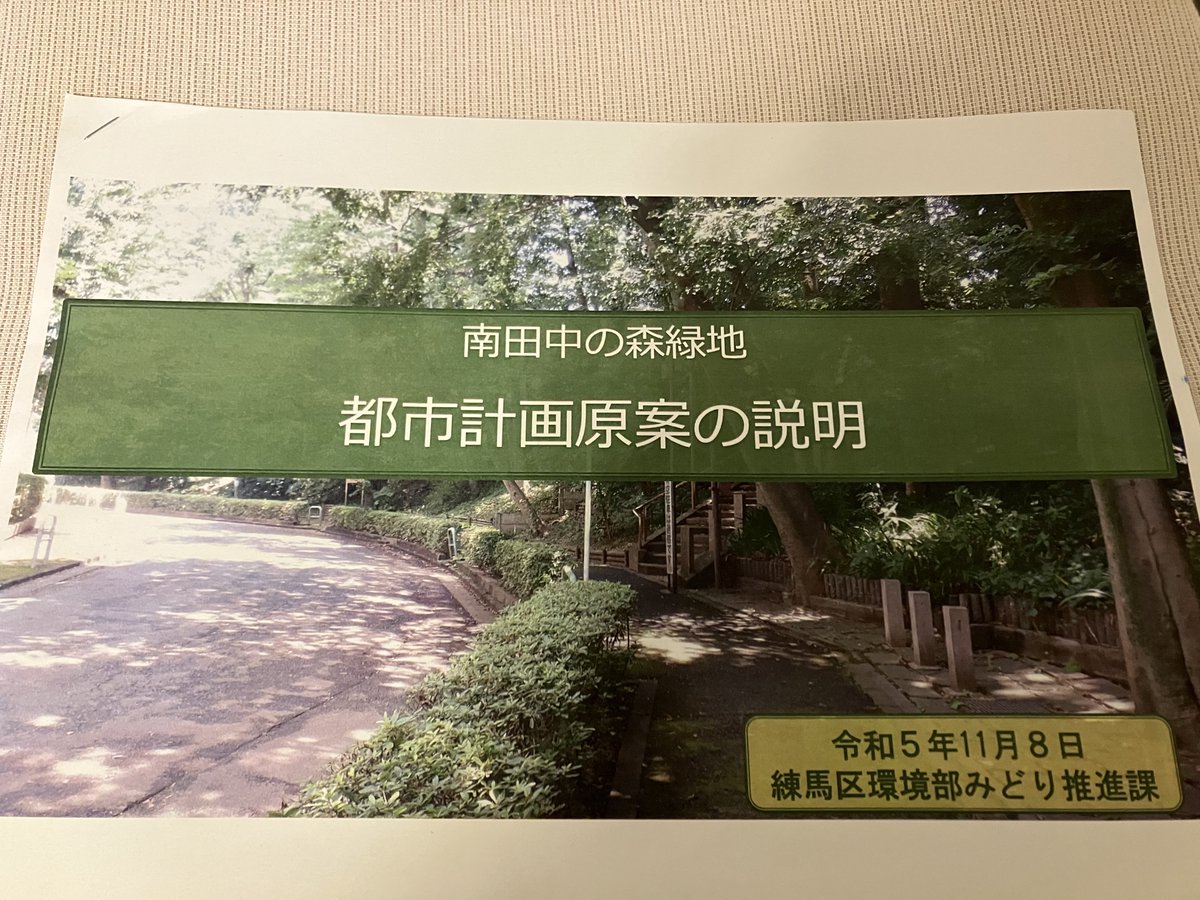 今日は、"南田中の森緑地“に都市計画をかけて「今後も樹林地として後世に残しましょう」という説明会に参加