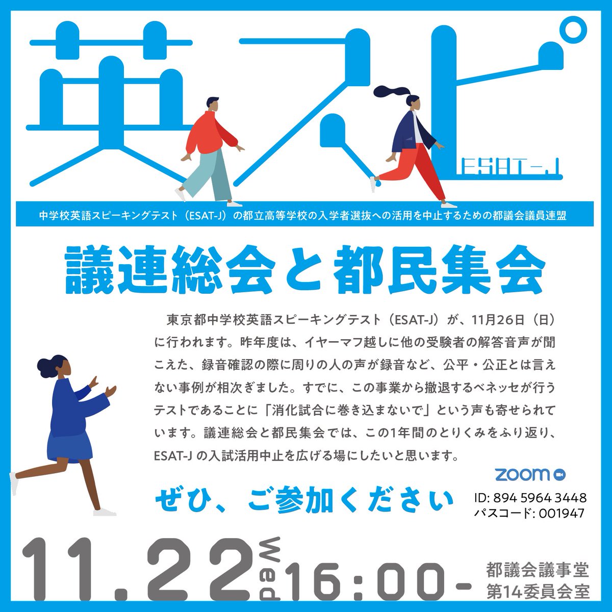 都教委は、今年も来年以降も英語スピーキングテストESATJを実施予定。入試にはとても使えないテストは中止せよ!との声を広げましょう!