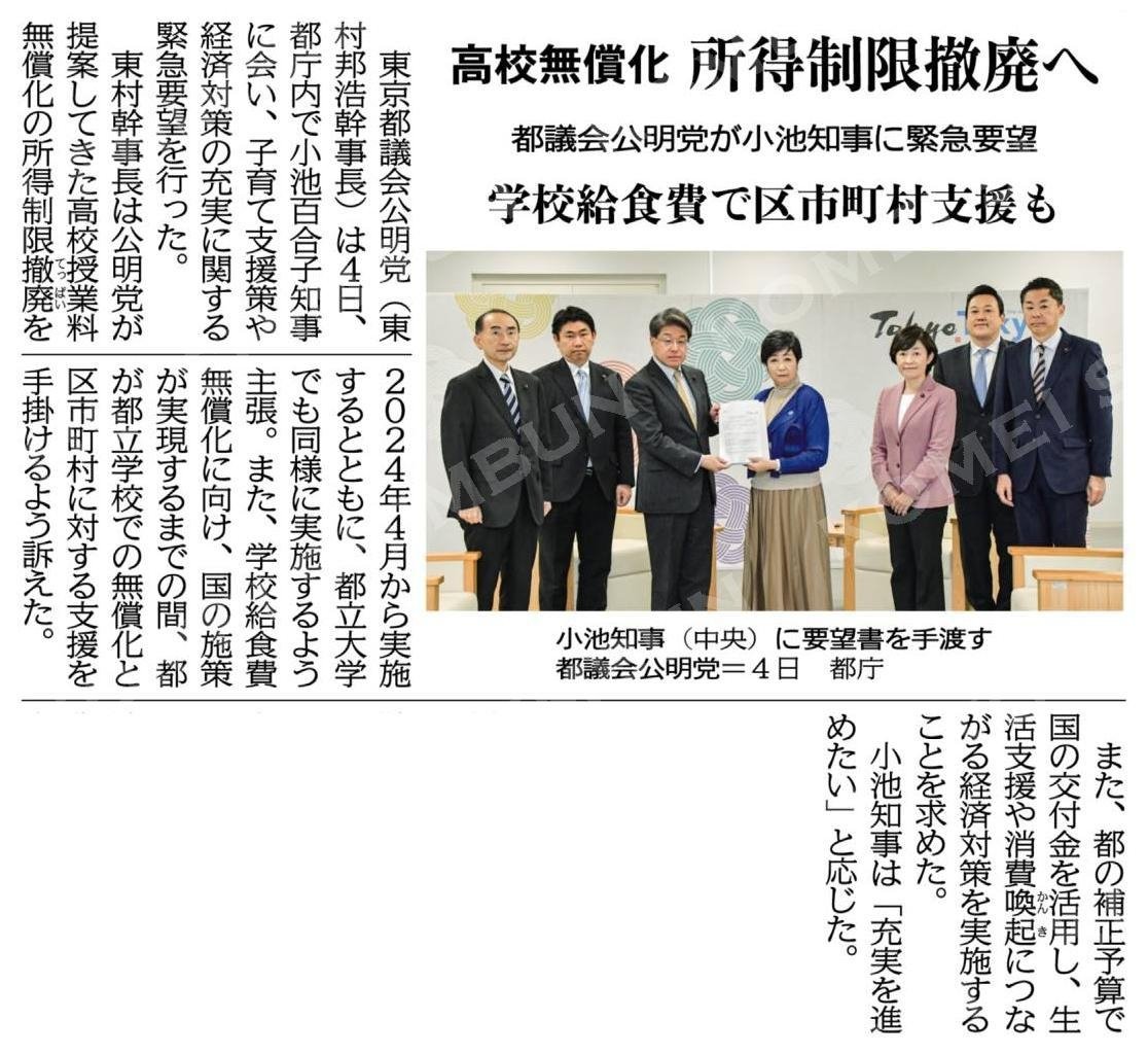 (高校無償化)所得制限撤廃へ/学校給食費で区市町村支援も/都議会公明党が小池知事に緊急要望 #公明新聞電子版 2023年12月05日付 www.komei.or.jp/newspaper-app/