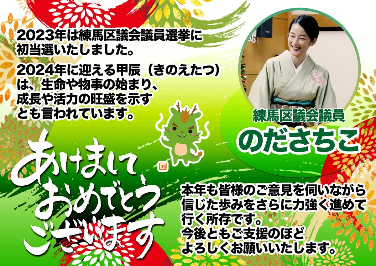2023年4月に練馬区議会議員選挙に初当選し私を区議会に送り出して下さった全ての皆様と区民の皆様のご期待、ご要望に応えるため、まだ小さいながらも確かな一歩を歩み始めました。2024年を迎え皆様のご意見を伺いながら歩みを力強く進めて行く所存です。今後ともご支援のほどよろしくお願いいたします