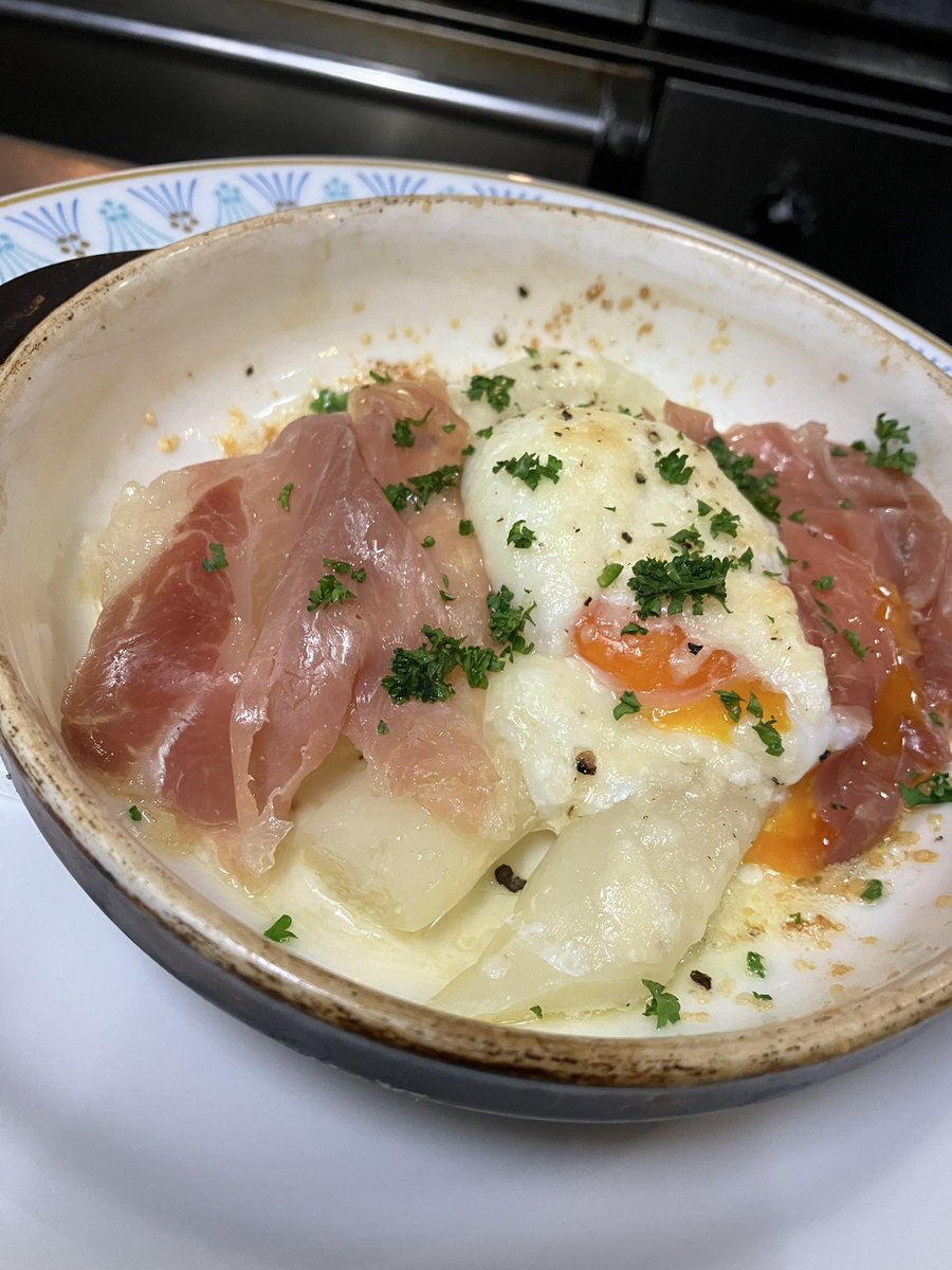 "ホワイトアスパラと生ハム、半熟卵のオーブン焼き" 旬のホワイトアスパラを温菜でご用意しています。 白ワインと相性ぴったり❣️ 春らしい前菜をお試し下さい🤗 連休は暖かい日が続きそうですね☀️ 明日は昼、夜ともに空席残りわずか🈳 お待ちしてます♪ #エノテカリオーネ #大泉学園