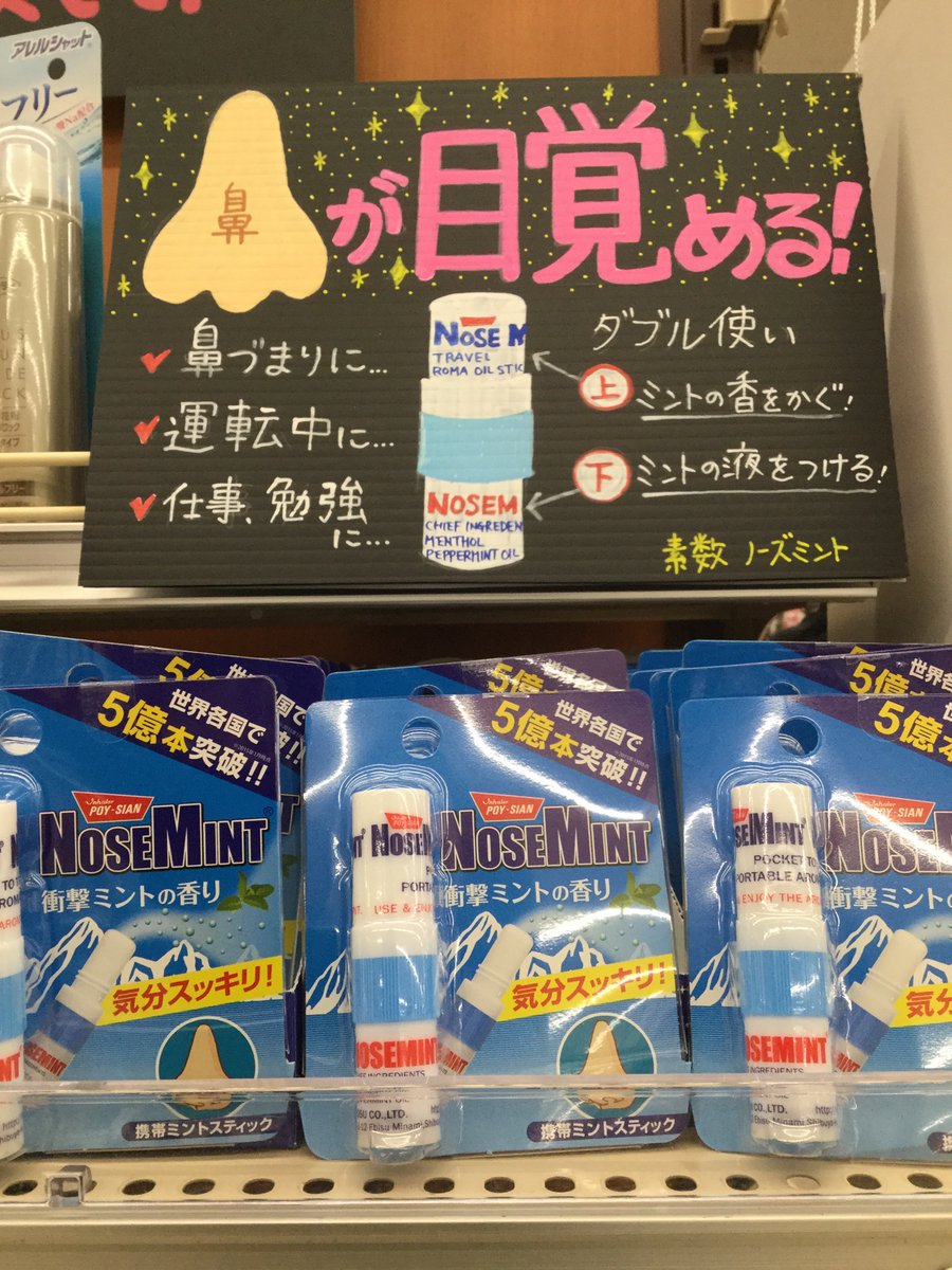 ミントの刺激でスッキリするアイテムだよ。上部を開けると香りの刺激。下部は液体が出てきます。花粉の鼻づまりに良い!!運転中の眠気覚ましや、勉強中の気分転換にも。