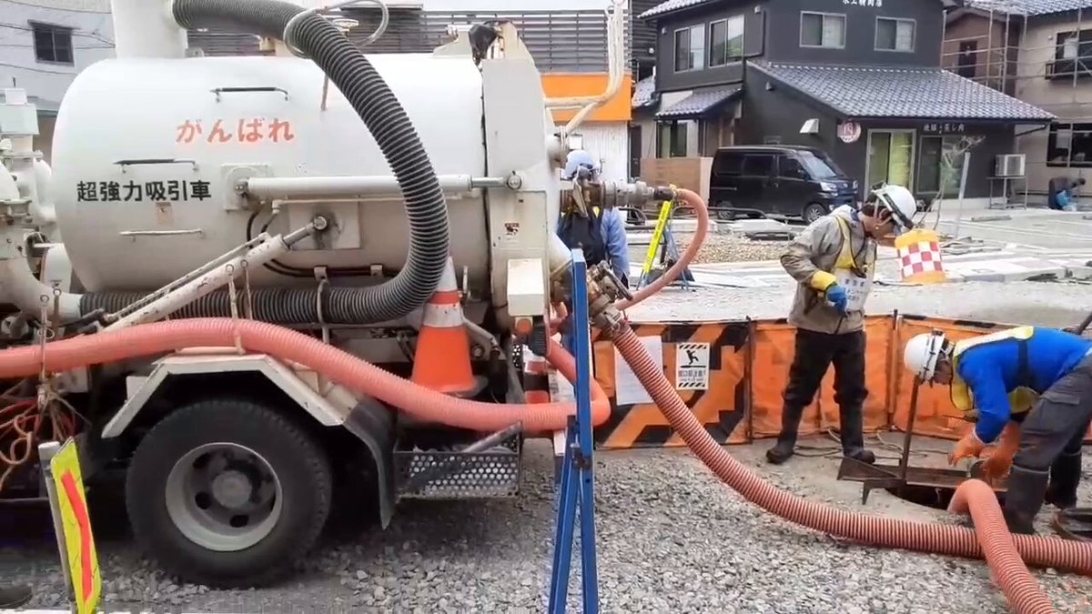 【令和6年能登半島地震への対応】(下水道局)輪島市内の現場で、超強力吸引車と超高圧洗浄車による作業を実施しています。車体には「がんばれ」の文字も。一日も早い復旧に向けて、作業車とともに頑張っていきます。 twitter.com/tocho_suido/stat..