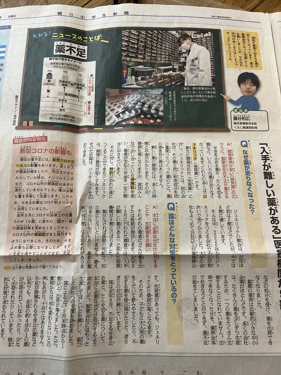 薬不足💊 朝日小学生新聞でも取り上げられていて、子どもと一緒にふむふむと。ジェネリックを進める国だけど、不正も相次いで本当によかったのか… 何件か回ってやっと手に入れた、と患者さんから聞くこともあり、早く需要と供給のバランスが取れてくれることを願うばかりです。 #訪問看護
