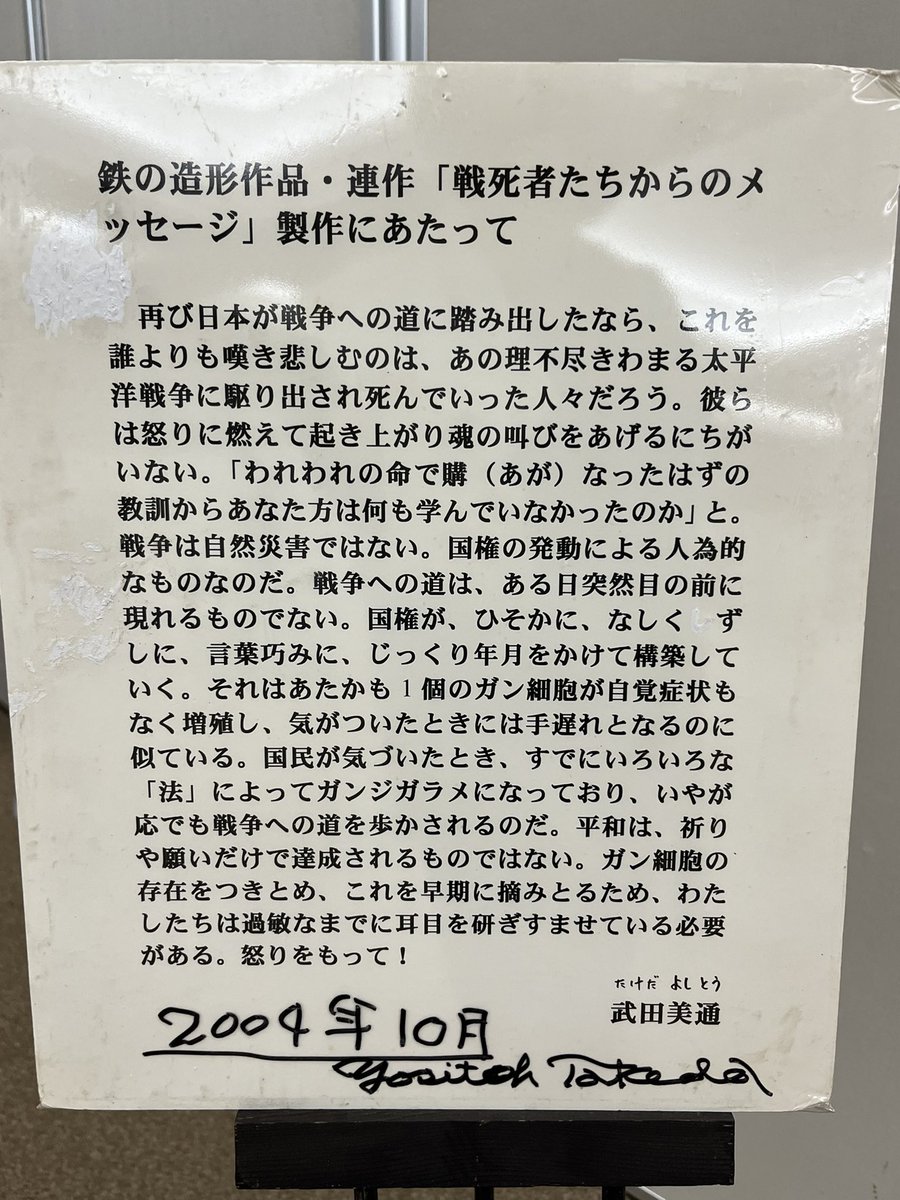 鉄の造形作家武田美通「戦死者たちからのメッセージ」全作品展INねりま、4/26まで開催しています(ココネリホール)。