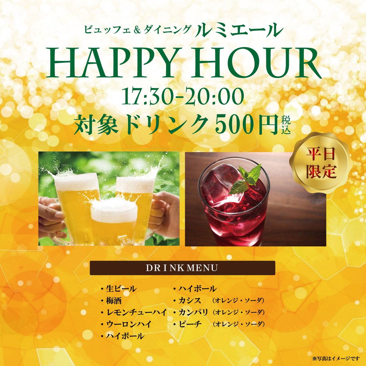 現在、Buffet&Diningルミエールの平日17時半~20時にて平日限定ハッピーアワーを実施中!!対象ドリンクが1杯500円でお楽しみいただけます。