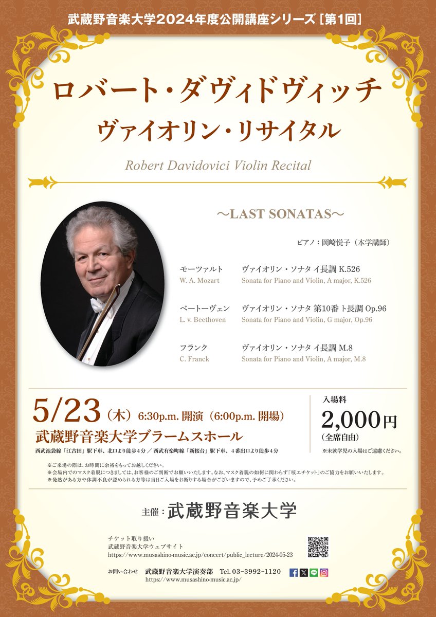 5/23(木)に #ブラームスホール にて「ロバート・ダヴィドヴィッチ ヴァイオリンリサイタル」が開催されます🎵
