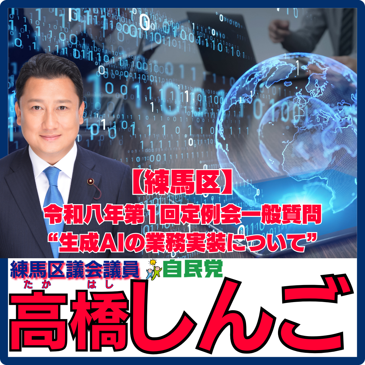 こんばんは、練馬区議会議員高橋しんごです。本日から、先日行われました“令和八年第一回一般質問 “生成AIの業務実装について””をお伝えいたします。※未定稿・多少加筆現筆有り生成AIの業務実装について◆..