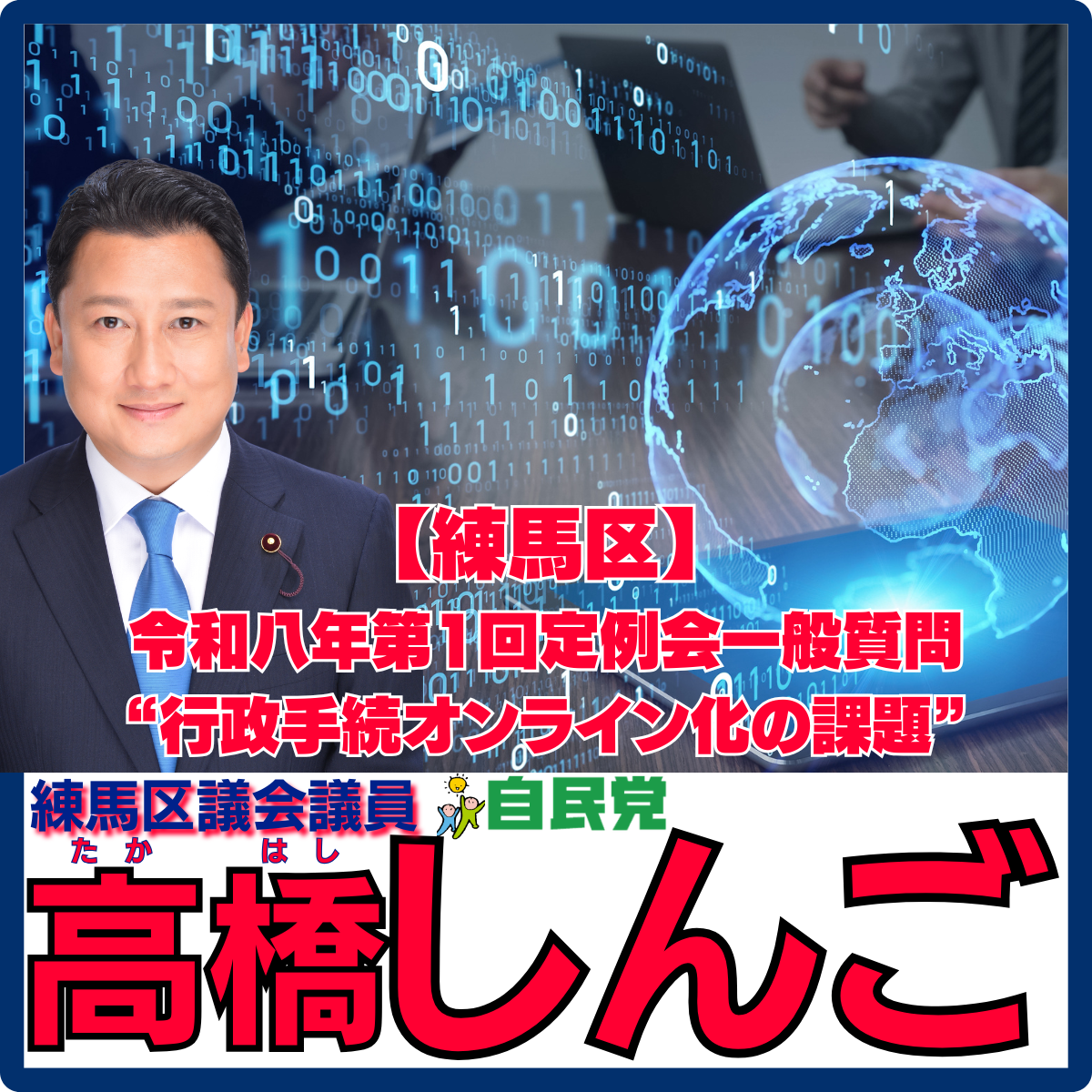 こんばんは、練馬区議会議員高橋しんごです。本日は、先日行われました“令和八年第一回一般質問 “行政手続オンライン化の課題””をアップします。※未定稿・多少加筆現筆有り行政手続オンライン化の課題◆質問(..