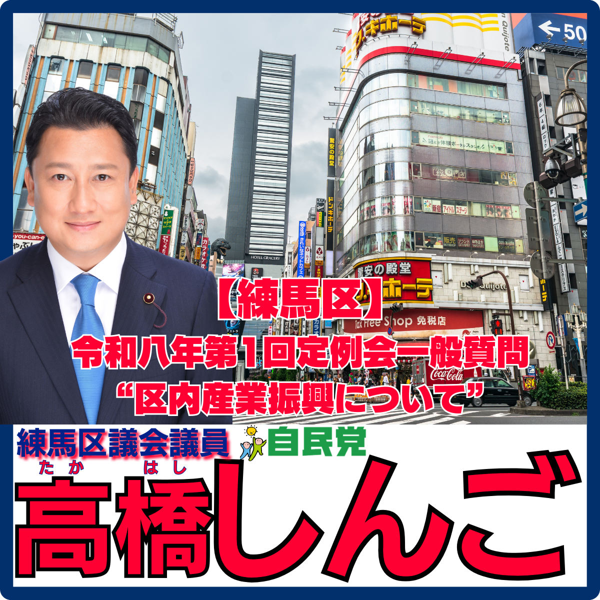 こんばんは、練馬区議会議員高橋しんごです。本日は、先日行われました“令和八年第一回一般質問 “区内産業振興について””をアップします。※未定稿・多少加筆現筆有り◆質問(高橋)次に、区内産業振興について..