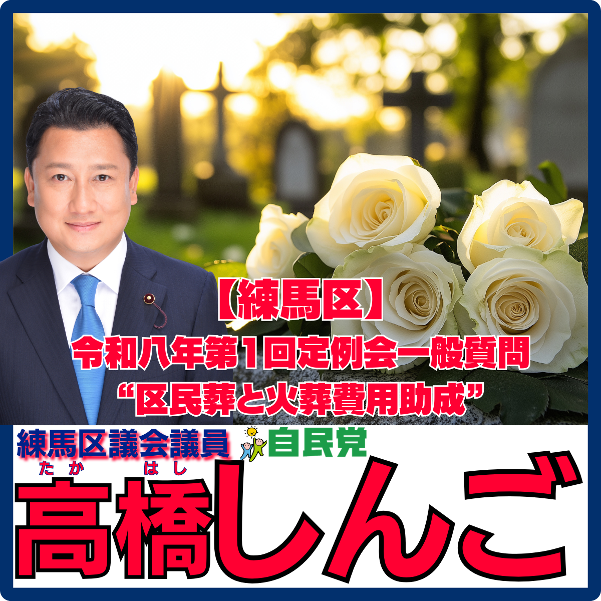 こんばんは、練馬区議会議員高橋しんごです。本日は、先日行われました“令和八年第一回一般質問 “区民葬と火葬費用助成””をアップします。※未定稿・多少加筆現筆有り◆質問(高橋)次に、区民葬と火葬費用助成..