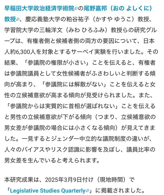 私の公明党への取り組み地方議員、国会議員に読んで欲しい調査なぜ参議院の方が衆議院よりも女性議員比率が高いのか政治における男女格差を解くカギを探るなぜ参議院の方が衆議院よりも女性議員比率が高いのか–早稲..
