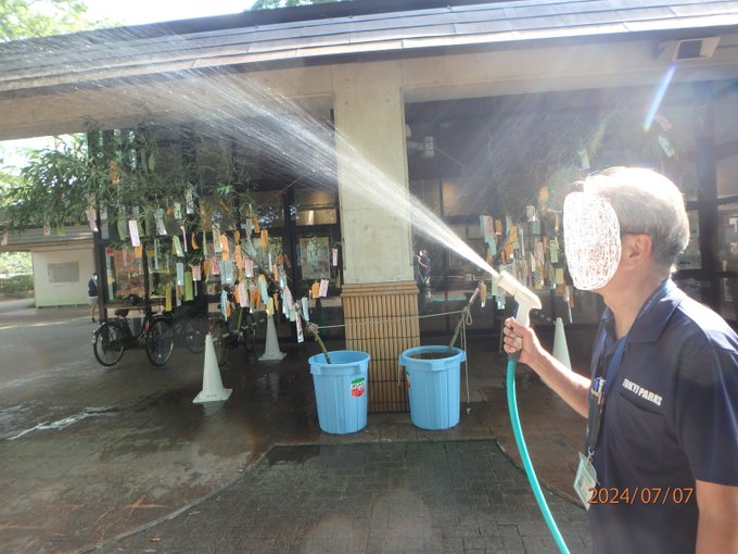 打ち水を行いました。こんやは、#七夕 。みなさまの願いが叶いますように♪ #城北中央公園