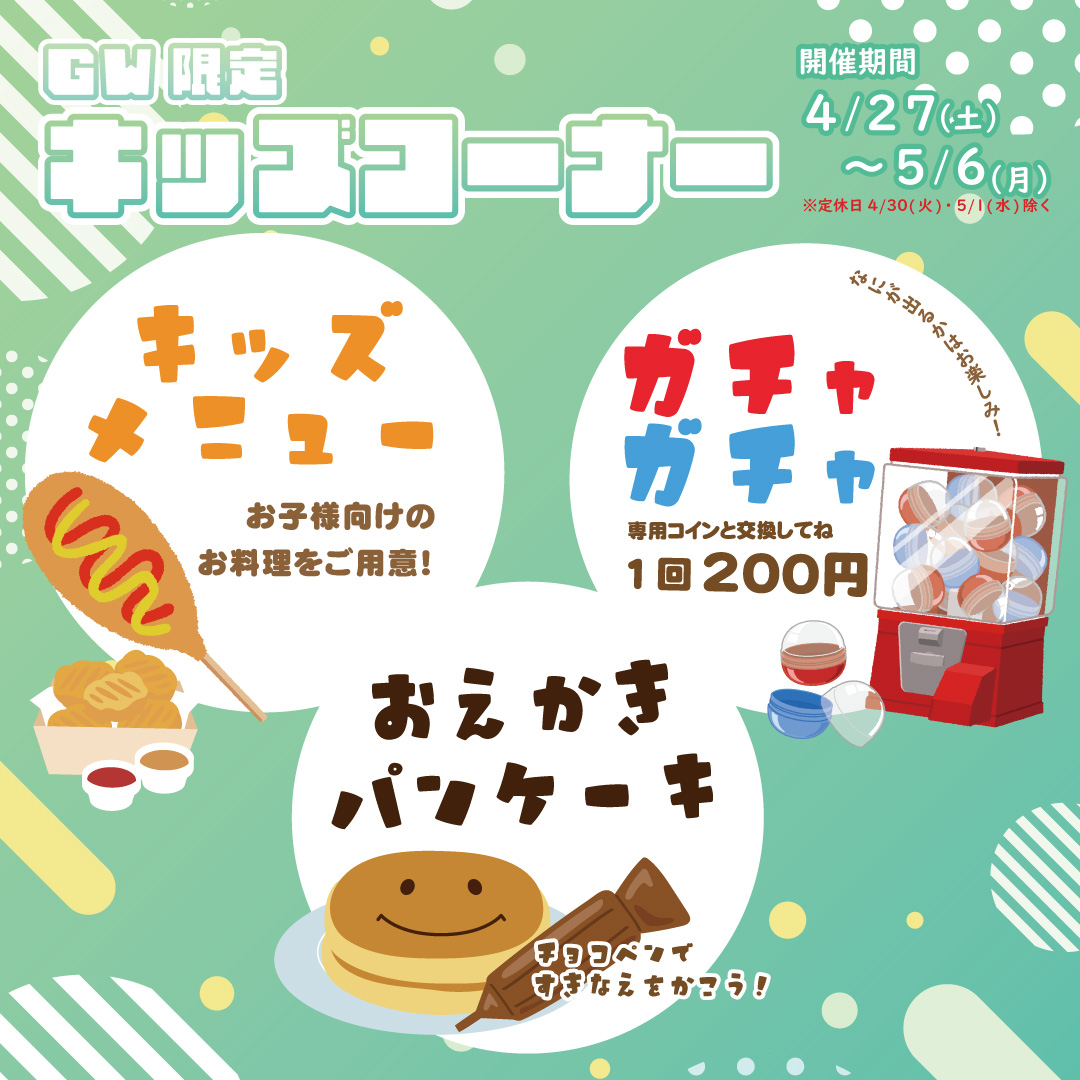 【Buffet&Diningルミエールからのお知らせ】明日、27日(土)~5月6日(月)までGW限定でキッズコーナーを特設!!お子様向けのメニューや、チョコペンを使用したおえかきパンケーキ、さ..
