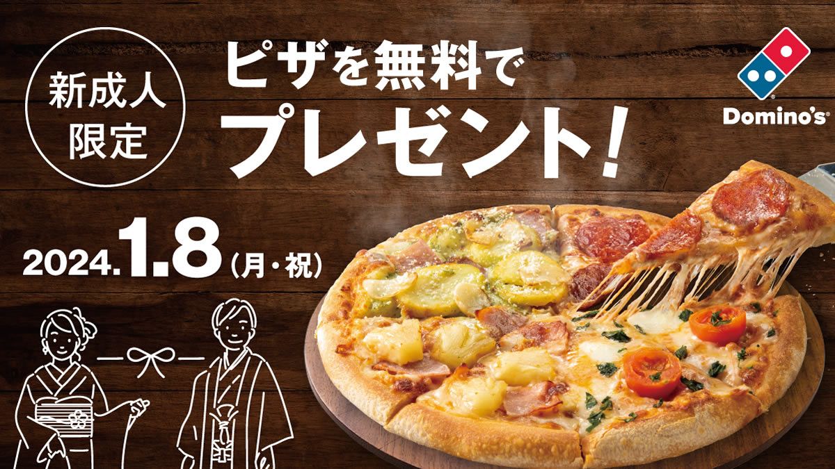 1/8(月祝)ドミノ・ピザ「成人の日無料ピザプレゼント」開催。18歳と20歳の方に「クワトロ・ハッピー」Sサイズ1枚を無料でプレゼント。持ち帰り限定→event-checker.info/domino..