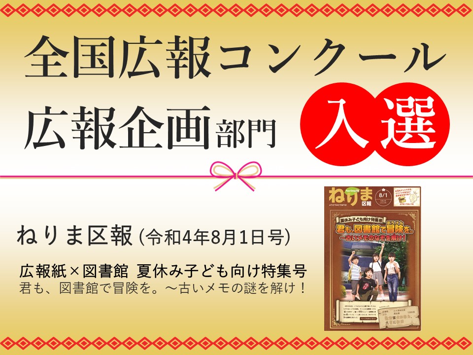 【全国広報コンクール広報企画部門で入選】毎年行われている全国広報コンクールで、ねりま区報と図書館がコラボした「夏休み子ども向け特集号 君も、図書館で冒険を。~古いメモの謎を解け!」が、広報企画部門で入..