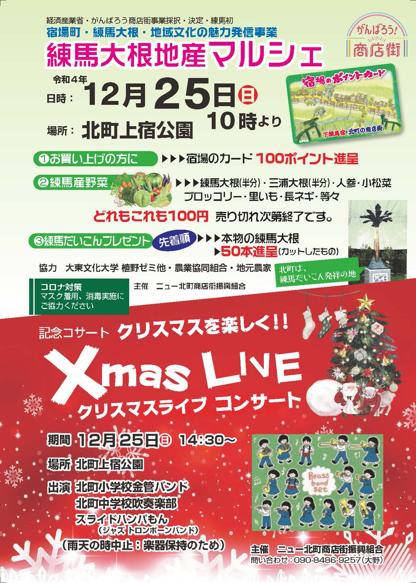 【練馬大根地産マルシェ・クリスマスライブコンサート 開催🎄】12/25(日)に北町上宿園にて「練馬大根地産マルシェ・クリスマスライブコンサート」(経済産業省・がんばろう商店街事業採択事業)を開催します..