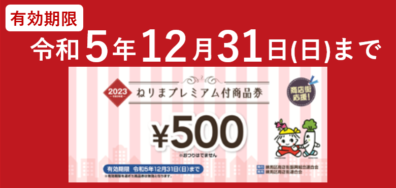 【有効期限は12月31日までです】ねりまプレミアム付商品券の有効期限は12月31日(日)です。区内商店街では、抽選で景品が当たる「練馬区商業まつり歳末売出し」を開催していますので、この機会に是非ご利用..