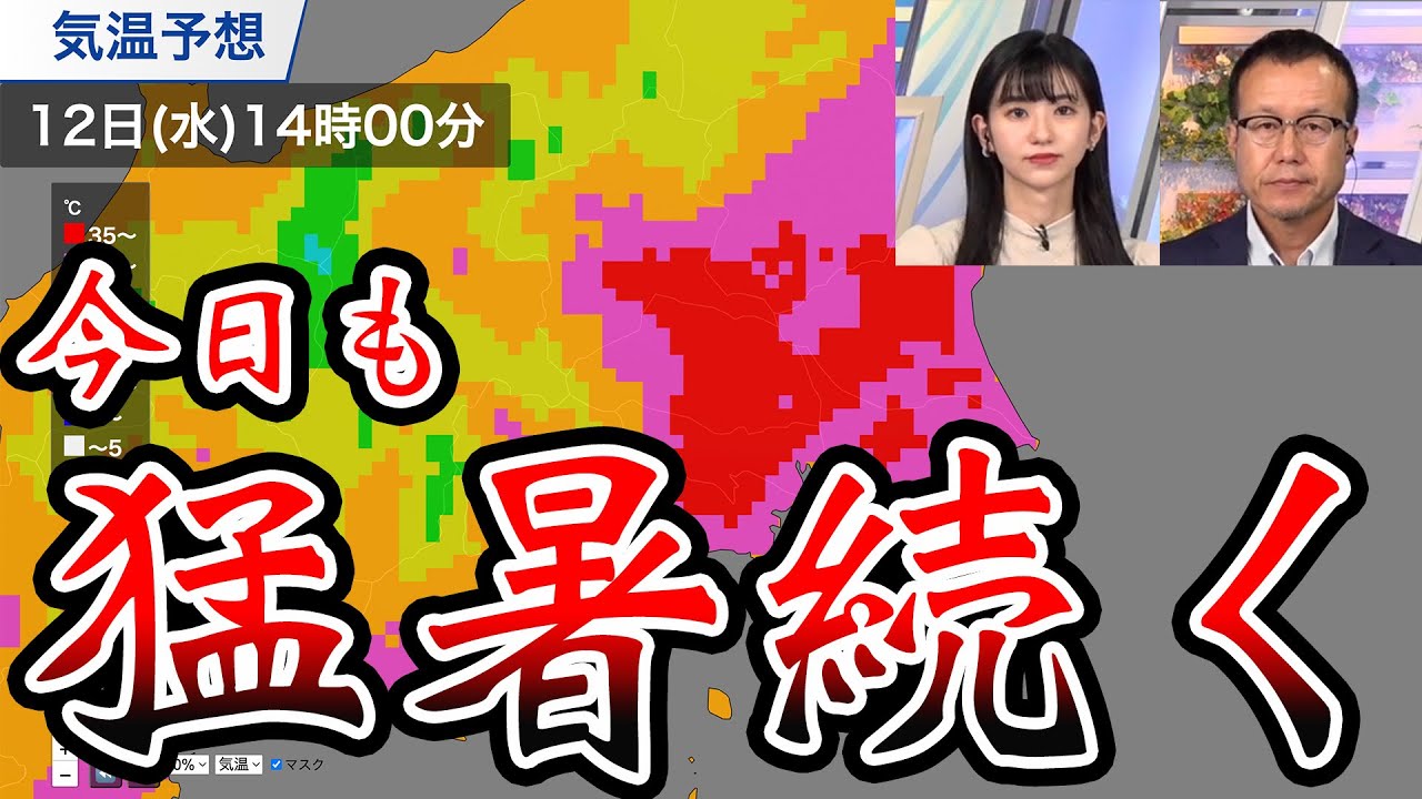 今日12日(水)も関東を中心に晴れて厳しい暑さが続き、東京都心も35℃まで上がり猛暑日になる予想です。連日の猛暑で身体への負担が大きくなっています。エアコンの効いた涼しい場所での休息や、こまめな水分補..