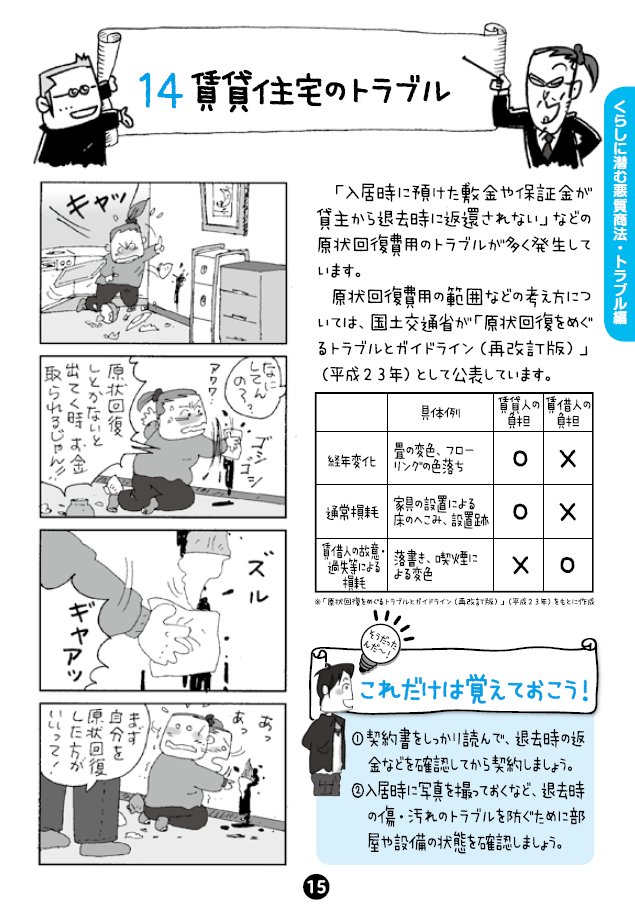 【#飯田橋四コマ劇場】◇賃貸住宅のトラブル◇「入居時に預けた敷金や保証金が貸主から退去時に返還されない」などの原状回復費用のトラブルが多く発生しています。www.shouhiseikatu.metro..