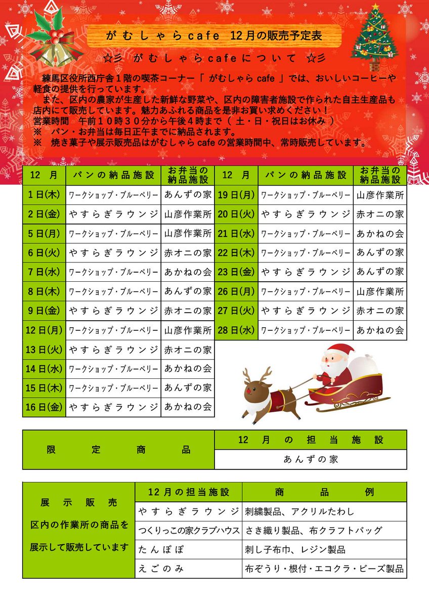 【がむしゃらCafeのお知らせ】区役所西庁舎1階の喫茶コーナー「がむしゃらcafe」では障害者施設の手づくり品販売を行っています😊今月の限定メニューは「あんずの家」が、「クリスマスクッキー」を販売して..
