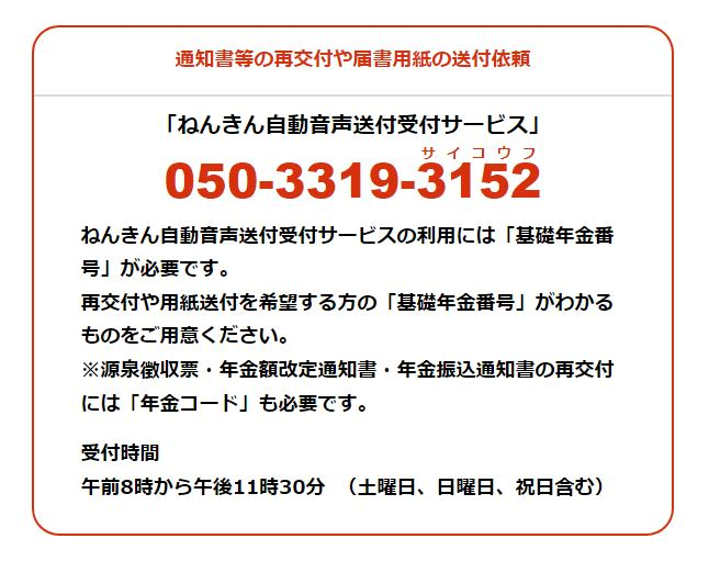 【「ねんきん自動音声送付受付サービス」のご案内】日本年金機構では、音声ガイダンスにしたがい、源泉徴収票等の各種通知書の再交付ができます。受付後、10日~2週間程度で発送します。ぜひご利用ください。詳し..