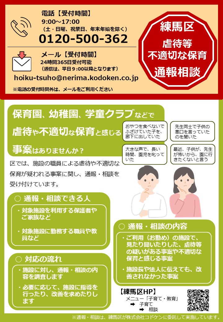 練馬区の窓口のほか、東京都も通報・相談窓口を設置しています。