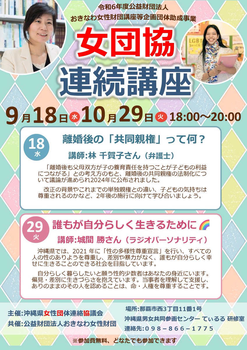 共催イベント延期のお知らせ9/18→9/25開催になりました♪令和6年度講座等企画団体助成事業沖縄県女性団体連絡協議会主催連続講座①「『離婚後の共同親権』って何?」講師林千賀子氏9/25(水)18時~..