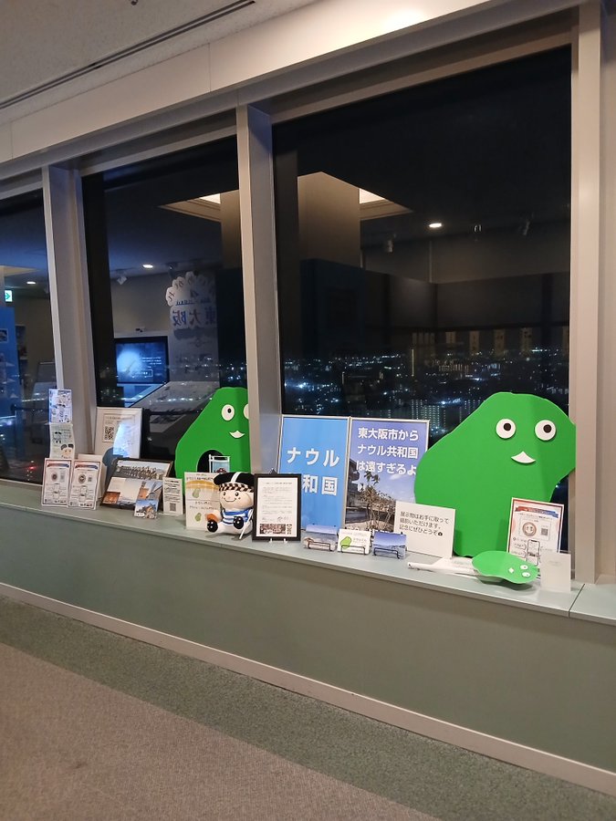 東大阪市ナウルくんフォトスポットは市役所22階展望フロアに展示しています。見学可能時間は9時から23時土日祝もオープンしております。ナウルくん顔出しパネルやファンアートとしていただいたナウルくん絵本@..