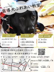 /盲導犬ふれあい教室~盲導犬ユーザーから学ぶ\長瀬青少年センターにて盲導犬ふれあい教室を開催します。日時:9月14日㈯13時30分~15時30分詳しくは添付画像をご覧いただくか、お問合せください。■問..