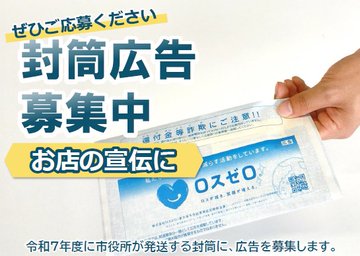 【封筒に広告を掲載しませんか?】来年度に使用する納税通知書用の封筒へ掲載する広告を募集します。企業PR・お店の宣伝に、ぜひご活用ください。申込期間:9月2日(月)~11月8日(金)【必着】詳しくは、市..