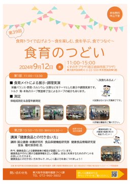 /9/12食育のつどいを開催!\9月の「食生活普及運動月間」にあわせて食育を学ぶイベントを開催します。健康食品との付き合い方についての講演をはじめ、栄養バランス・野菜・カルシウム・災害などをテーマとし..