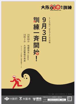 \大阪880万人訓練/9月3日(火)15時から、大阪府内で「大阪880万人訓練」が実施されます。15時3分と5分頃には、訓練用の「エリアメール/緊急速報メール」が携帯電話など(対応機種のみ)に届きます..