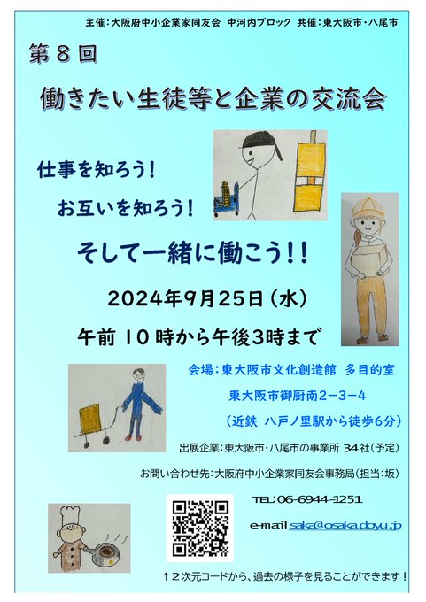 【働きたい生徒等と企業の交流会を開催!】東大阪市・八尾市の事業所34社が企業の魅力や社会的役割を紹介します。◇日時9月25日㈬10時~15時(入場自由)◇場所文化創造館多目的室◇対象東大阪市・八尾市・..