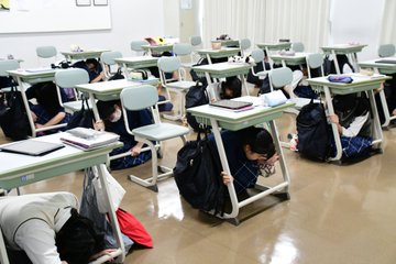 \市内の高校でも訓練/大阪府民に対し訓練として災害情報を伝達する「大阪880万人訓練」。東大阪大学敬愛高校でも避難訓練が行われ、生徒・教員など約800人が参加しました。訓練では、地震発生直後、生徒が机..