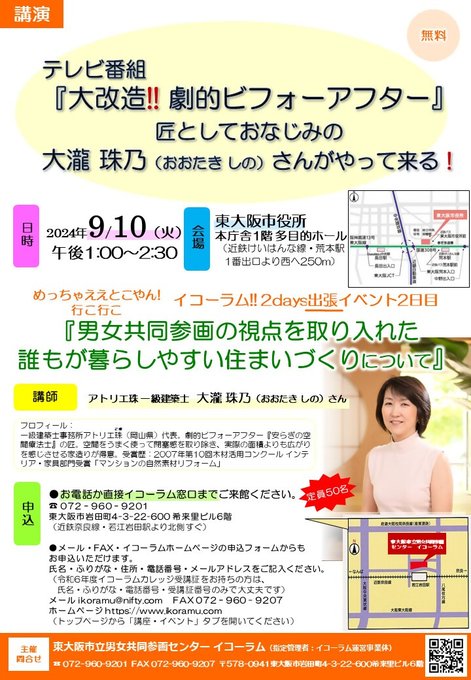 「大改造!!劇的ビフォーアフター」に「匠」として出演された大瀧珠乃さんが「誰もが暮らしやすい住まいづくり」について講演会を開催されます。誰もが快適に住むことができる住まいづくりにむけて話を聞きませんか..