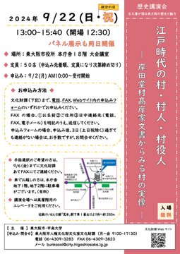 /9月22日歴史講演会を開催「古文書が語る東大阪の歴史と魅力」\江戸時代の岸田堂村髙岸家の文書の紹介と村・村人・村役人についての講演会を開催します。髙岸家には数多くの文書が残されており、専門家が解説し..