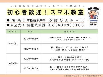 /定員に空きあり!スマホ教室\スマホ教室の定員にまだ空きがあります。リピーターの受講も歓迎します。情報政策課(℡06-4309-3108)へ電話で申込みください。詳しくは画像、もしくはこちら↓http..