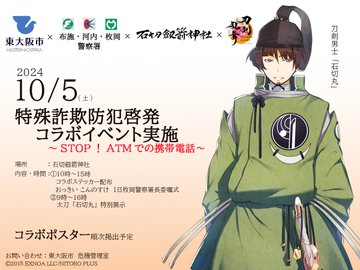 東大阪市×布施・河内・枚岡警察署×#石切劔箭神社×#刀剣乱舞ONLINE「石切丸」特殊詐欺防犯啓発コラボ実施!コラボポスターを順次掲出!10/5(土)に石切劔箭神社にて、おっきいこんのすけによるコラボ..