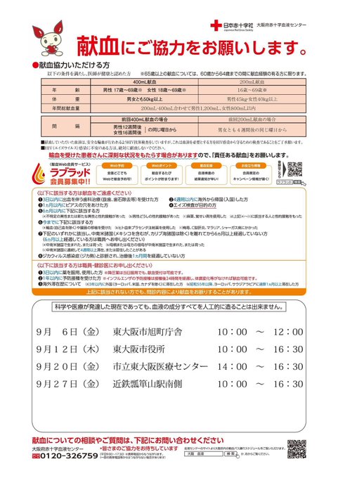 【献血にご協力を】現在大阪府内ですべての血液型の血液が不足しています。東大阪市内に献血バスがやってきますので、若い世代の方をはじめ、皆さまのご協力をお願いします!