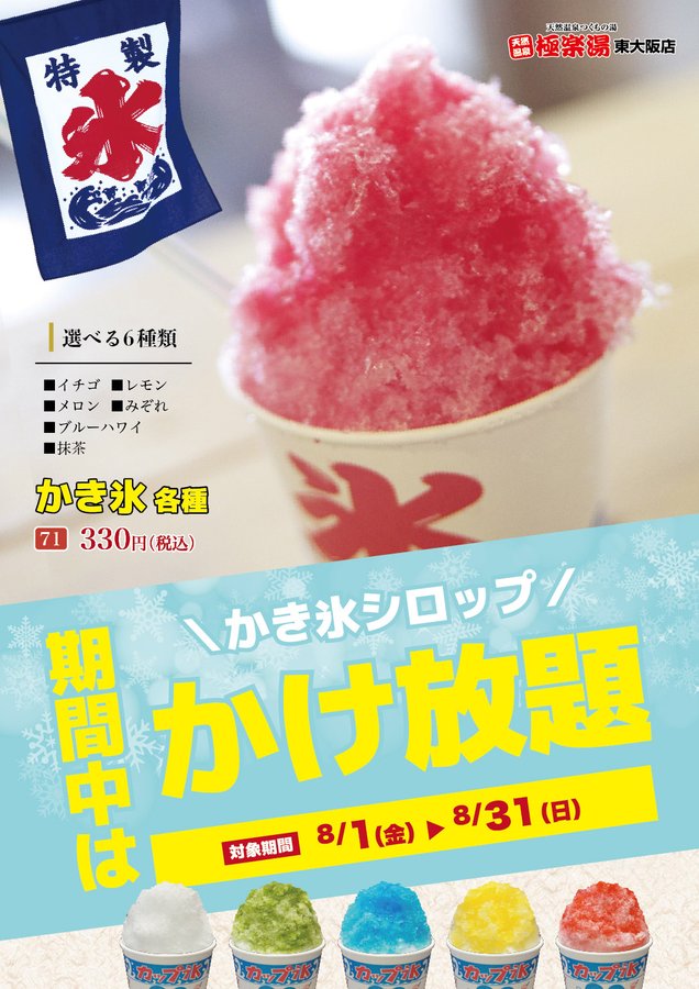 真夏に嬉しいこと!→甘くてシャリシャリのかき氷を食べること。真夏に避けたいこと!→かき氷の甘い味がだんだんと薄くなっていくこと。最後まで甘くて、冷たいかき氷が最強かけ放題が叶えます!#極楽湯#極楽湯東..