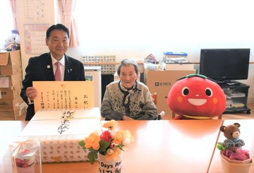【市内最高齢角谷さんの長寿をお祝い】現在107歳の角谷ノブヱさんを市長が訪問し、長寿をお祝いするとともに記念品を贈呈しました。角谷さんは、新聞を読むことが日課で、表彰状の文面もしっかりと目を通す姿が印..