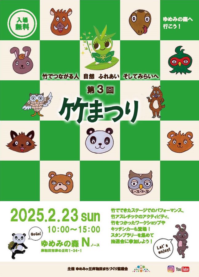 ゆめみヶ丘岸和田の地域資源である竹や、エリアの魅力を発信・PRする「竹まつり」を開催します!竹ステージイベントや竹アスレチック、スタンプラリー、各種ブースなどが出展予定です。市制施行100周年記念事業..
