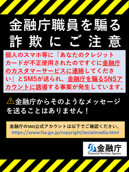 金融庁を騙(かた)るSNSアカウントにご注意「あなたのクレジットカードが不正使用されたのですぐに金融庁カスタマーサービスに連絡して下さい」とSMSが届き、金融庁を騙るSNSアカウントに誘導する事案が発..