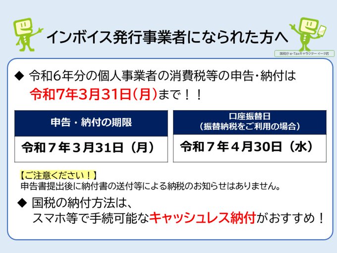 ╱インボイス発行事業者になられた方へ╲消費税の納付に関する情報を国税庁HPに掲載しています確定申告って、いつまでに払うの?どうやって払うの?納税資金の準備について知りたい!一つでも気になる方はこちらを..