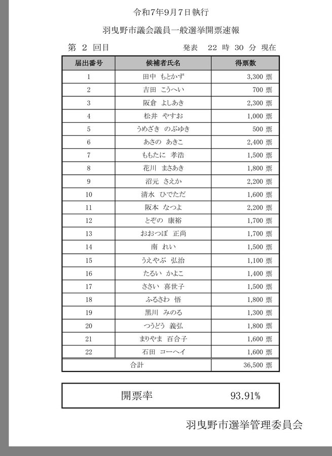 #羽曳野市議会議員選挙開票状況22:30https://city.habikino.lg.jp/material/files/group/90/20250907-kai-2230.pdf…