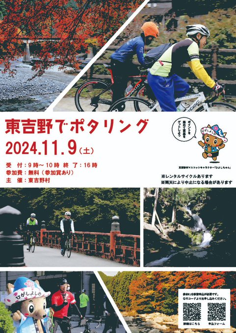 堺市と友好都市である東吉野村でサイクリングイベント「東吉野でポタリング」が開催されます秋の東吉野村を自転車で楽しみましょう開催日:11月9日(土)(要事前申込。無料)申込み等の詳細は下記リンクからご確..